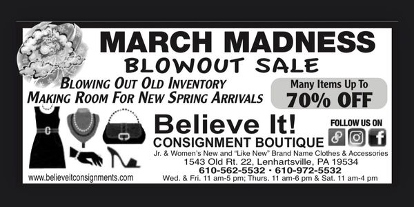 Full Moon Madness Sale happens every month, on or about the day of the full moon. Check out our Facebook page facebook.com/BelieveItConsignments/ for more details about the current sales!